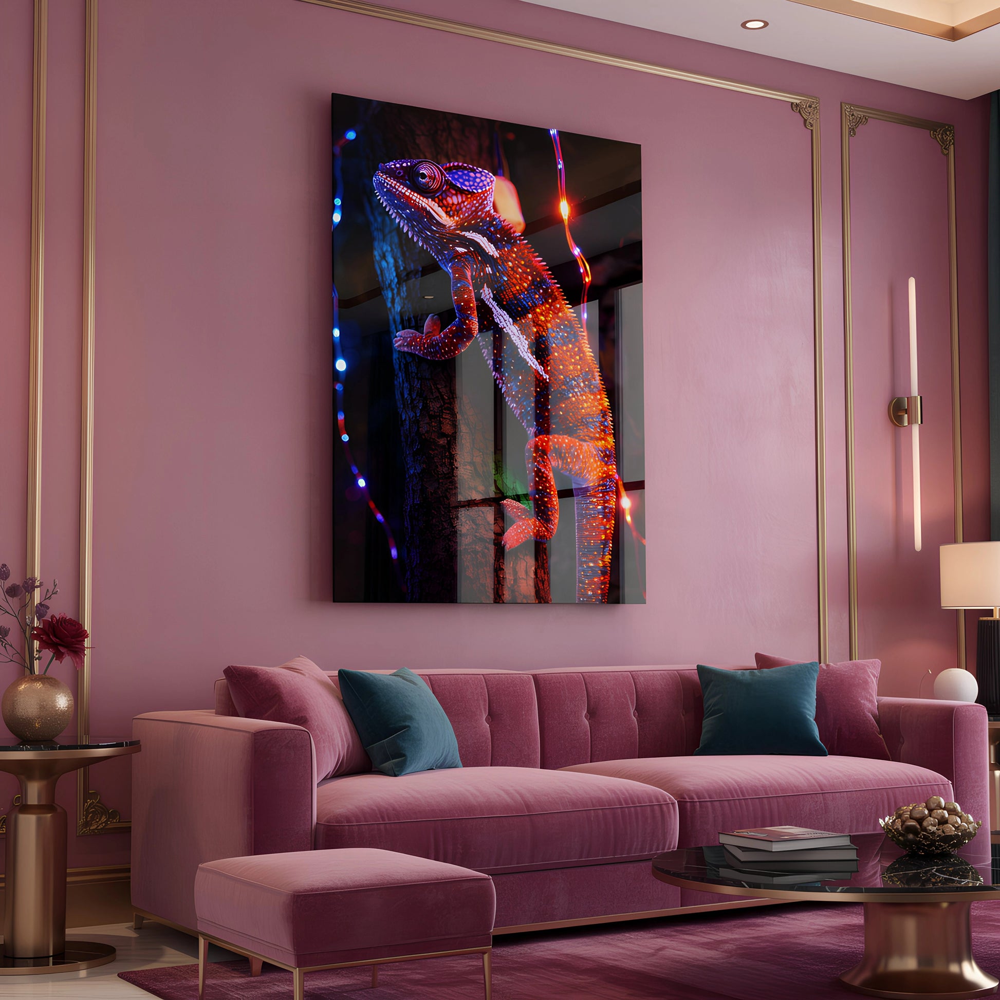 Step into a spectrum of color and detail. his Chromatic Chameleon glass wall art showcases a vivid close-up of a chameleon illuminated by radiant neon hues, each scale crisply defined, each color layered with depth and intensity.